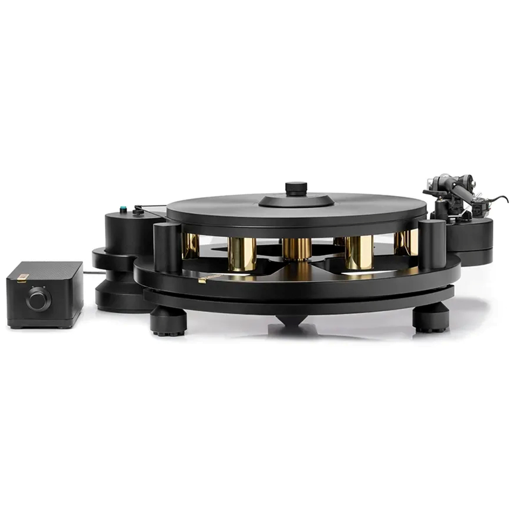 El sistema motorizado de Gyro está diseñado para ofrecer una estabilidad y un silencio absolutos. La pesada carcasa del motor, independiente, es totalmente independiente del plato giratorio: su única conexión es la correa de transmisión. Esta separación física reduce drásticamente la transferencia de las vibraciones del motor a los sensibles componentes de reproducción, lo que preserva los detalles musicales y la claridad.