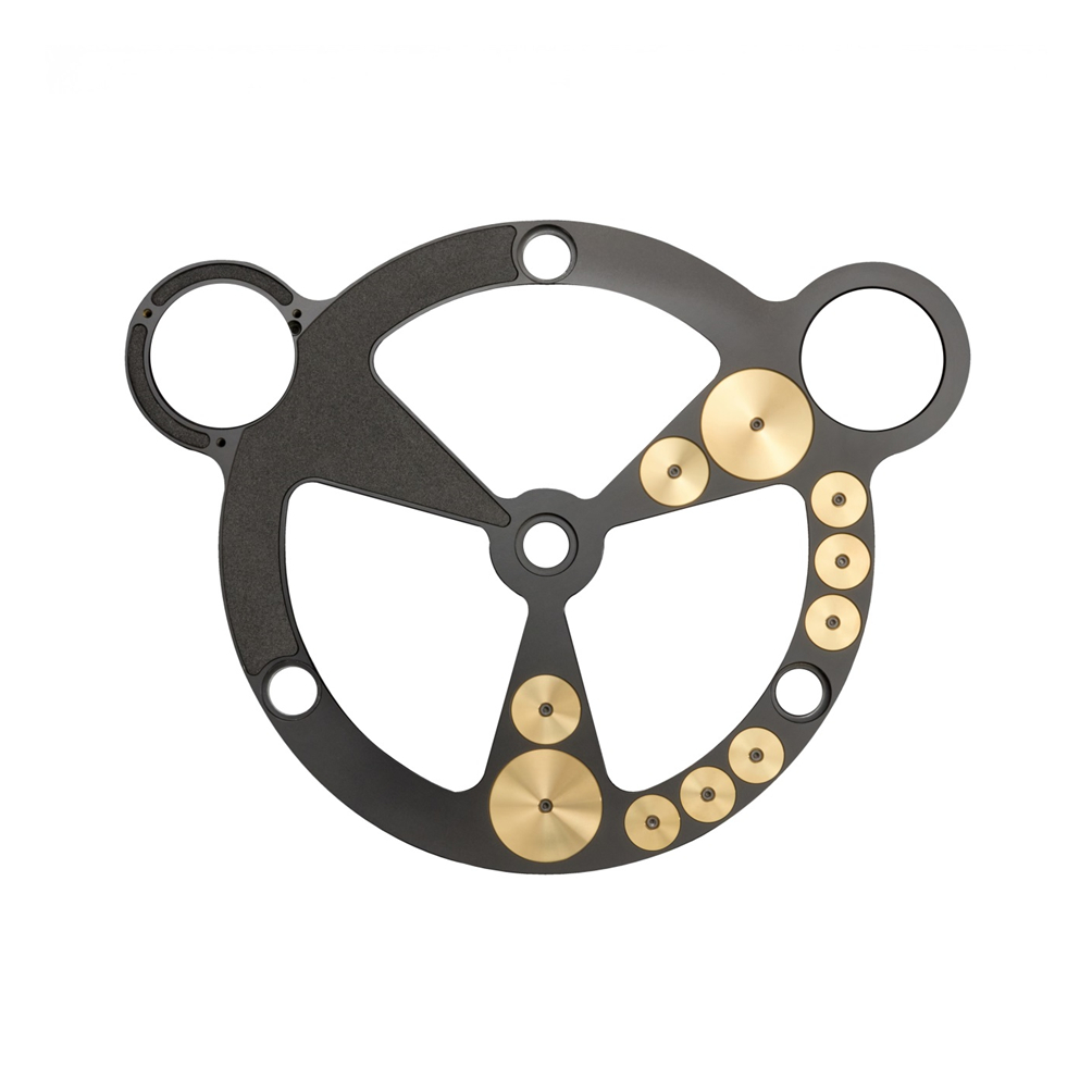 Los pesos de latón incrustados, cuidadosamente calculados y colocados, ayudan a equilibrar el conjunto del brazo fonocaptor y absorben la energía vibratoria. Alrededor del soporte del brazo fonocaptor, las inserciones de espuma amortiguadora suprimen los reflejos, lo que garantiza que la interacción entre la aguja y el vinilo no se vea obstaculizada y que no se enmascaren los detalles musicales más sutiles.