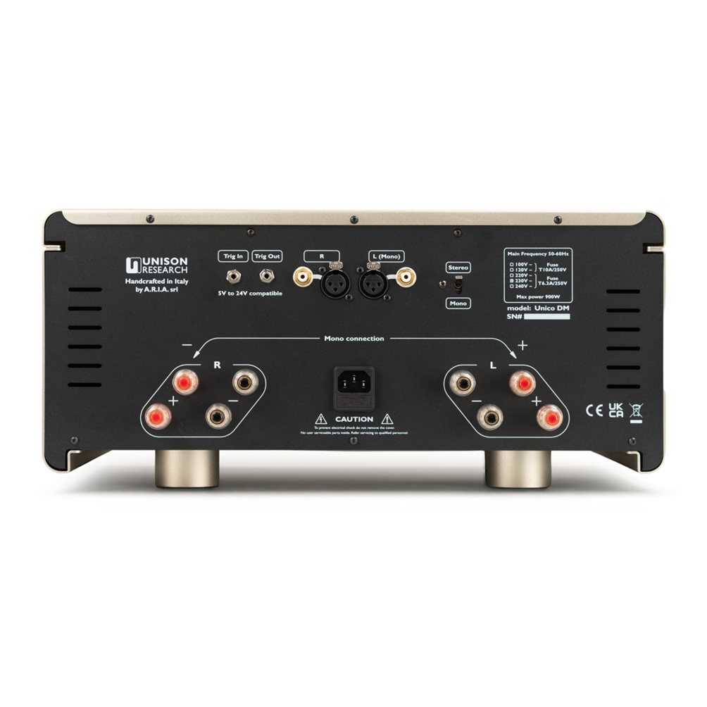Al mismo tiempo, el Unico DM v2 destaca por su elevada potencia y su generosa reserva energética, capaz de gobernar con autoridad incluso altavoces exigentes. En funcionamiento mono (puenteado), las dos fuentes de alimentación se conectan eléctricamente en paralelo, transformando la arquitectura dual-mono en un auténtico amplificador monofónico con una única y potente fuente de alimentación. Esta configuración aprovecha al máximo la energía disponible, ofreciendo dinámica inmediata, gran impacto y una sensación de control absoluto, sin renunciar nunca a la refinación y naturalidad.